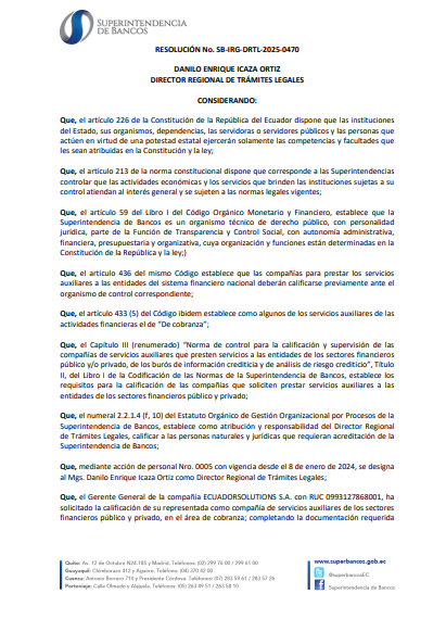 Estamos certificados por la Superintendencia de Bancos, lo que respalda nuestra capacidad para operar con entidades financieras, organismos públicos y empresas del sector privado.